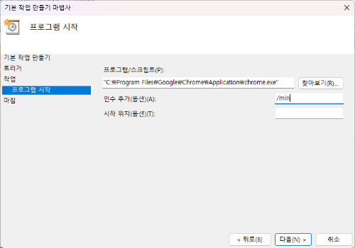 ✔ 인수 추가에 /min 넣어주시면 시스템 트레이 최소화된 상태로 프로그램이 안보이게 실행되게 합니다.